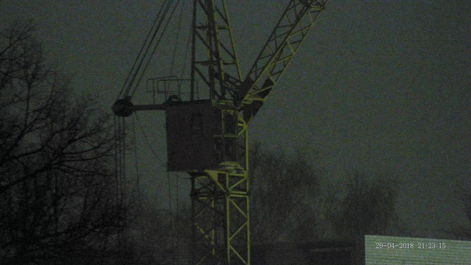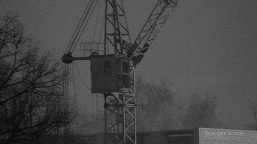 Если при включенном ИК-излучателе мы четко видим очертания крыши, печной трубы и бревенчатую стену, то с выключенным прожектором ничего, кроме темного провала, не видно. К тому же, как это ни парадоксально, оценке эффективности инфракрасной подсветки мешает слишком чувствительный датчик камеры, который способен подробно фиксировать детали даже при свете Луны или редких уличных фонарей. Получается, что при наличии даже слабого света инфракрасная подсветка фактически становится лишней, только ухудшая четкость картинки. Причина очевидна: мелкая взвесь в воздухе, которая рассеивает луч. Следующие стоп-кадры показывают объект — строительный кран — находящийся на расстоянии 320 метров от камеры.