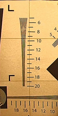 Измерение разрешающей способности камеры нельзя произвести посредством съемки обычной тестовой таблицы, для этого таблица должна быть гигантских размеров, поскольку камера не может сфокусироваться на близкорасположенных объектах. Чтобы измерить разрешающую способность, мы прибегли к другому способу: к съемке отдельного участка таблицы, который распечатан на большом листе. Такая съемка проводится с постепенным изменением расстояния от камеры до мишени, а впоследствии полученная видеозапись совмещается в видеоредакторе с исходным рисунком таблицы до совпадения пропорций. В результате получается 100%-ный кроп целого кадра с ключевым элементом таблицы, показывающий разрешающую способность.