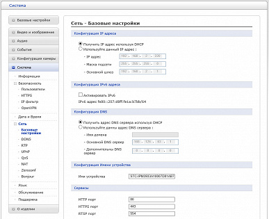 Параметры камеры традиционно для подобных аппаратов разбиты на тематические категории: настройки сети, видеокодеков, характера изображения, аудиопараметры, системные и прочие настройки.