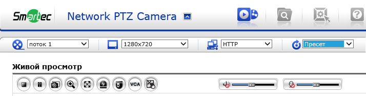 В нижней части панели управления присутствуют кнопки быстрых действий: остановка и пауза трансляции, создание стоп-кадра, цифровое увеличение выбранного участка, переход в полноэкранный режим просмотра, вызов модулей ручной активации записи и управления приводами камеры, включение функций распознавания объектов и быстрый переход с зумом в указанную зону. Расположенные рядом ползунки отвечают за громкость подключенного к камере динамика и чувствительность аудиовхода соответственно.