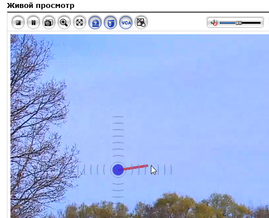 Такие операции, как поворот и наклон камеры, могут осуществляться и непосредственно мышкой. Для этого нужно поместить курсор в окно просмотра, и, удерживая левую кнопку, чуть сдвинуть мышь в нужную сторону. Камера послушно последует за курсором. А благодаря переменной скорости электроприводов, скорость перемещения позволяется изменять динамически: чем дальше курсор находится от центральной точки, тем быстрее работают моторы. Это довольно удобный способ позиционирования, при некотором навыке получается даже плавно отслеживать перемещение какого-то объекта, находящегося на большом удалении от камеры.