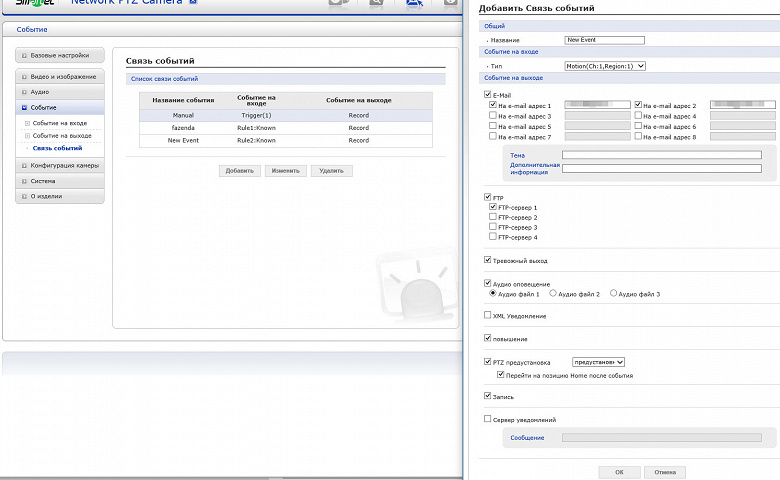 Все эти действия производятся камерой сразу по наступлении заданного события. Допускается создать до 15 связей-сценариев, которые будут работать одновременно.