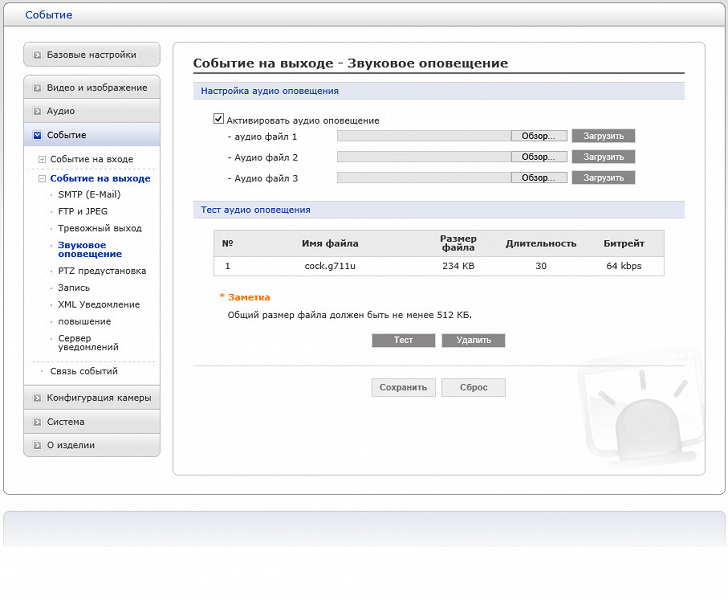 Все перечисленные выше условия могут являться толчком к какому-либо действию камеры. Выбор действий так же богат, как и перечень самих событий-источников: отправка E-Mail восьми получателям, отправка снимков на четыре FTP-сервера, активация тревожного выхода (например, для включения внешнего прожектора, замка двери, сирены и т. д.), звуковое оповещение (на линейный аудиовыход камеры поступает заранее загруженная аудиозапись), переход камеры в предустановленное положение (пресет), запись тревожного видеоролика на карту памяти, XML-уведомление на указанный сервер и порт, изменение качества видеопотока при срабатывании тревоги, отправка сообщения на сервер уведомлений с указанием типа, метода, ссылки, порта и реквизитов пользователя.