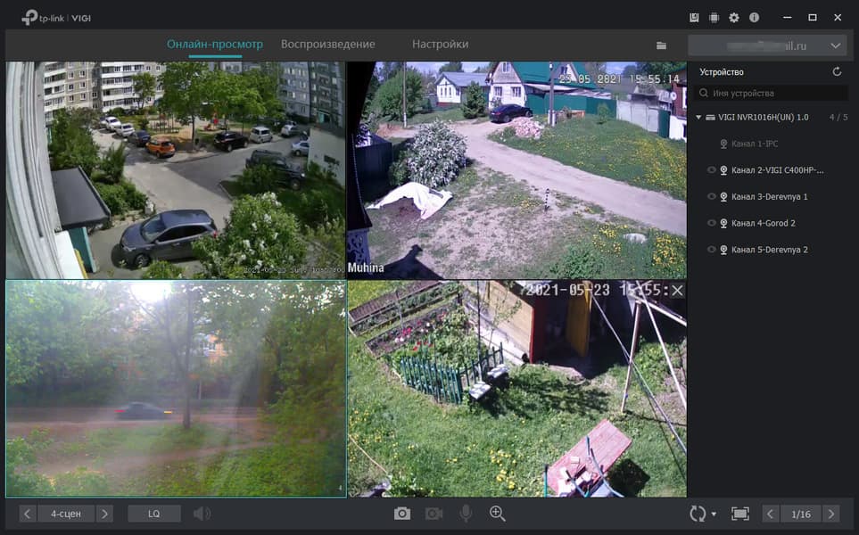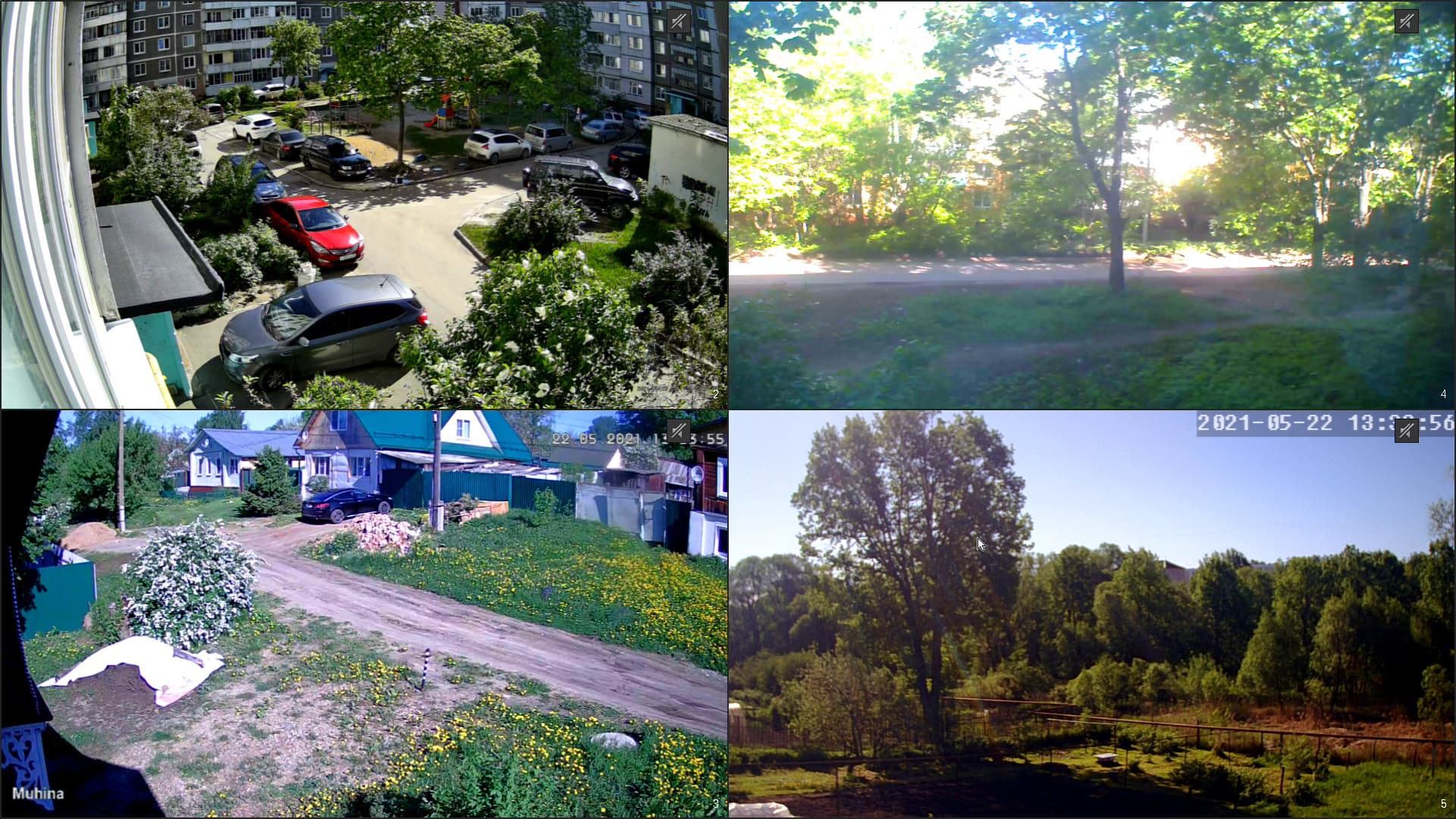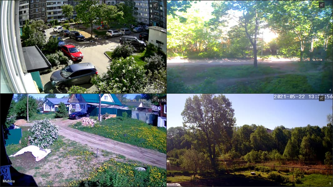 После того, как камеры подключены, пользователь увидит стандартную видеостену с сигналом подключенных камер. На время тестирования мы подключили к регистратору четыре камеры, работающие в локальной сети: две камеры, находящиеся в квартире с регистратором, и еще две, работающие в частном доме за много километров (локальные сети объединены в одну посредством VPN).