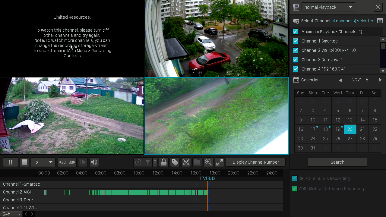 Отдельно отметим процесс просмотра архива записей. Он быстр и удобен, но в некоторых случаях мощности процессора оказывается недостаточно, чтобы вывести картинку сразу с нескольких камер. Дело в том, что размер кадра каждой камеры в нашем случае оказался слишком большим.