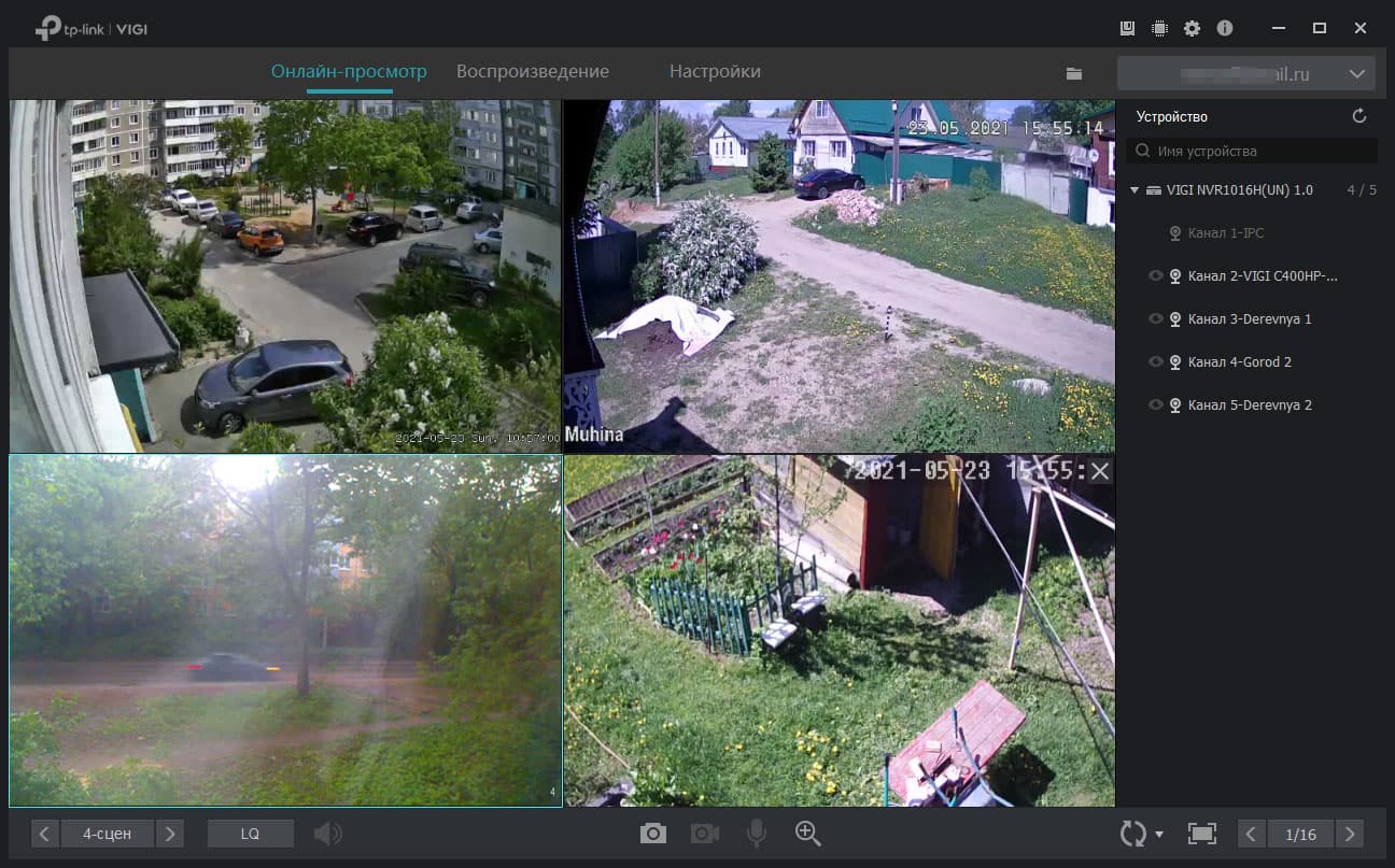 VIGI Security Manager мы рассматривали в обзоре IP-камеры TP-Link VIGI C400HP. Нетрудно понять, что это — универсальное приложение, которое может работать со всем оборудованием линейки VIGI. Здесь всего три вкладки: Онлайн-просмотр, Воспроизведение и Настройки. Никаких камер и устройств вам добавлять не придется — стоит войти в имеющуюся учетную запись TP-Link, как все подключенные к ней устройства сами «подтянутся» из облака.