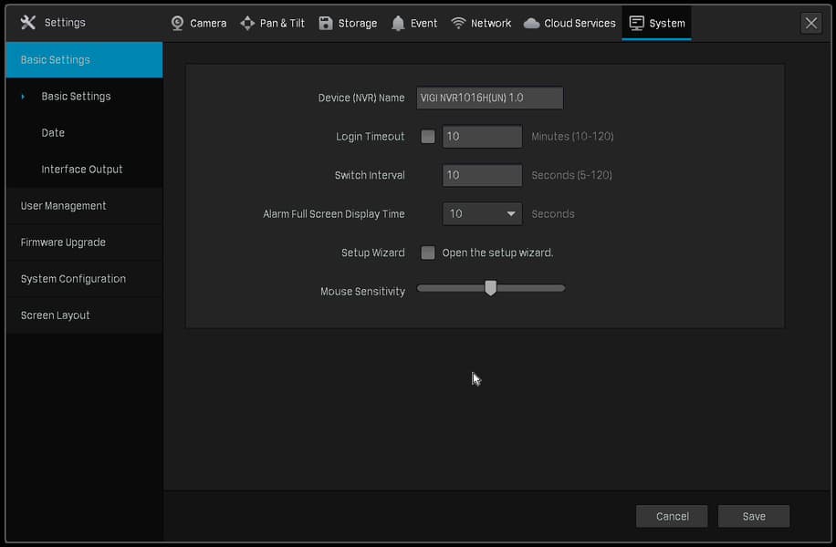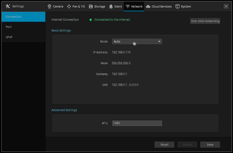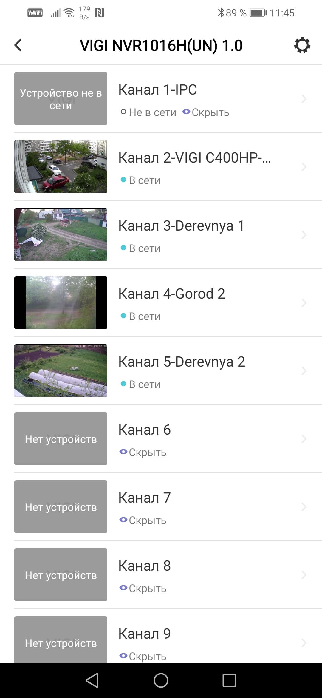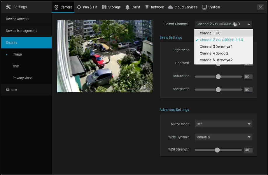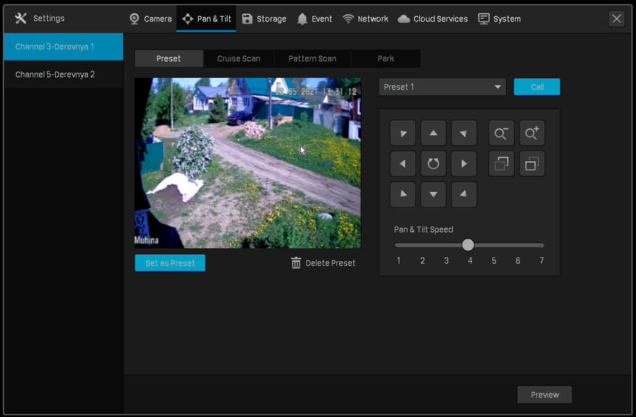 Вообще, регистратор хорошо «понимает», с какой камерой он имеет дело и какие их функции он может обработать. Например, в пункте настроек Pan & Tilt отображаются лишь те камеры, которые имеют функцию поворота и наклона. Обе эти камеры работают, находясь в деревне, мы их так и назвали: Деревня 1 и Деревня 2.