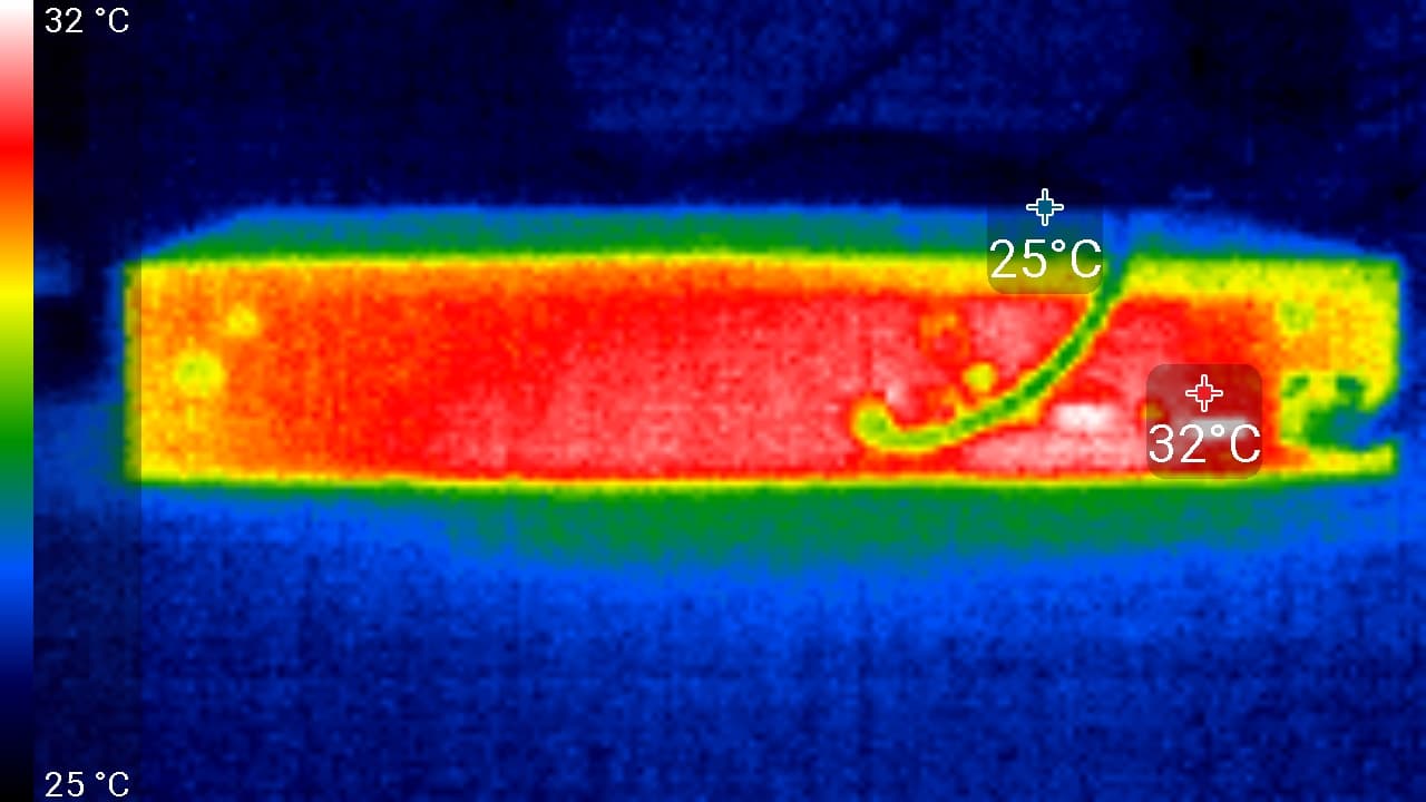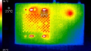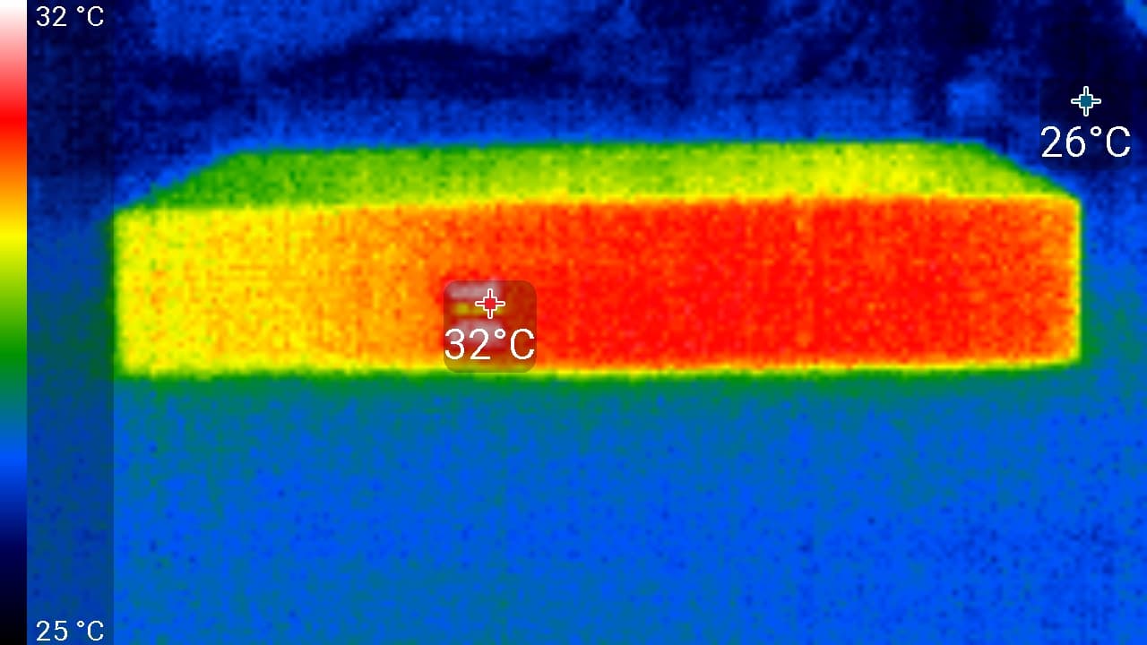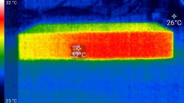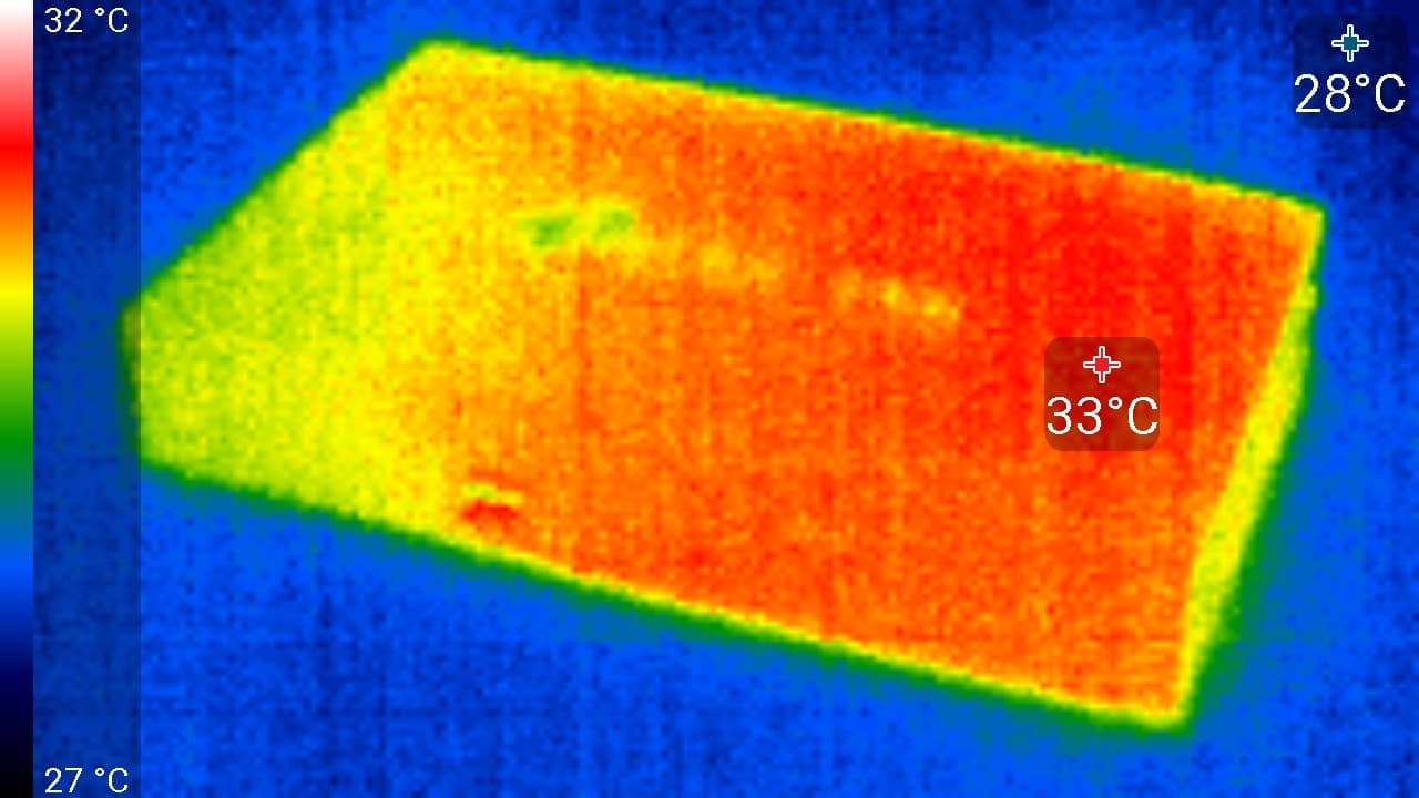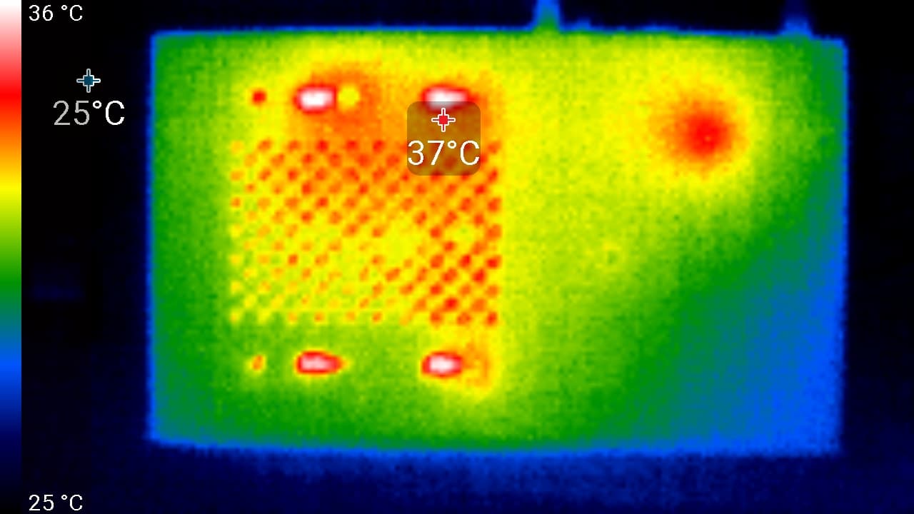 Наконец, коснемся еще одного важного аспекта: нагрева регистратора. Следующие тепловизионные снимки сделаны после нескольких суток работы регистратора в помещении с температурой около 26 °C. Можно видеть, что крышка корпуса нагрелась до 33 °C, а жесткий диск дотянул лишь до 37 °C.