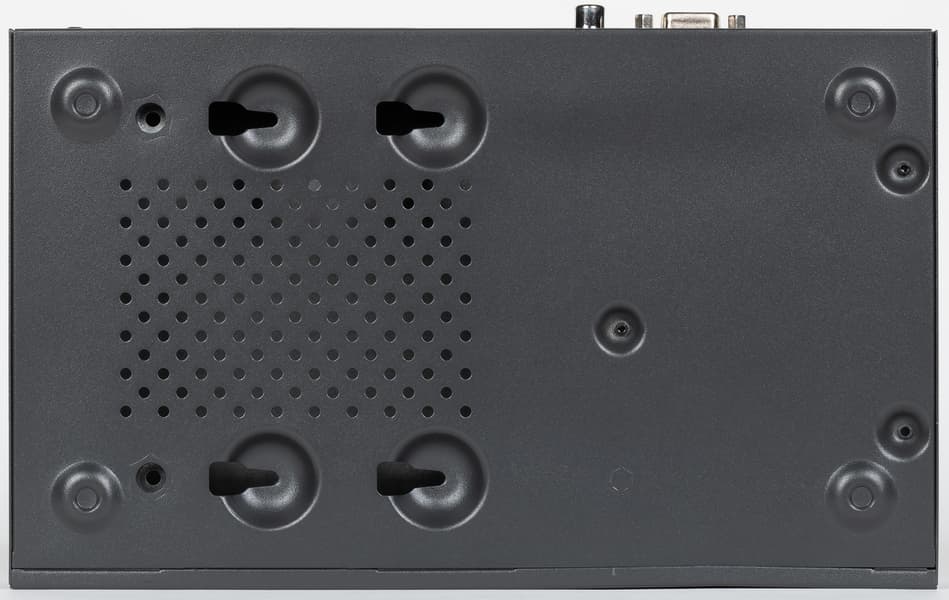 Верхняя часть крышки гладкая, без вырезов — это хорошо, пыль не будет скапливаться или попадать внутрь корпуса. Зато в днище предусмотрены отверстия для привинчивания жесткого диска, прорези для крепления регистратора к вертикальным поверхностям, а также вентиляционная решетка, через которую проникает воздух, охлаждающий жесткий диск.