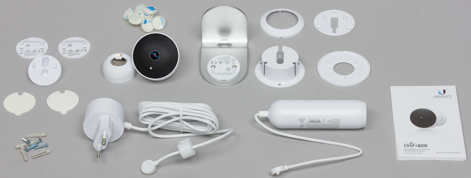 Несмотря на скромные размеры упаковки, внутри прячется огромное количество аксессуаров. Огромное в сравнении с обычными камерами наблюдения, к которым обычно прилагается только адаптер питания и одно крепление (хотя и крепление не всегда увидишь). Здесь же — металлическая подставка, пять крепежных площадок для внешней проводки и одна площадка для внутренней, два крепежа с клейкой основой, две лицевых накладки, саморезы с дюбелями и даже приклеивающиеся клипсы для укладки кабеля. Помимо такого монтажного богатства, в комплекте имеется адаптер питания с длинным кабелем и еще один гаджет, напоминающий переходник для все того же питания камеры. Этот переходник имеет крайне подозрительную функциональность, о ней мы расскажем позже. Венчает комплект сложенное вдесятеро бумажное руководство пользователя. Краткое, оно, тем не менее, содержит достаточное количество информации, чтобы понять назначение крепежных принадлежностей. Однако подключению уделен всего один абзац, а о настройках не сказано вообще ни слова. Впрочем, это давно стало досадным трендом практически во всех технических сферах.