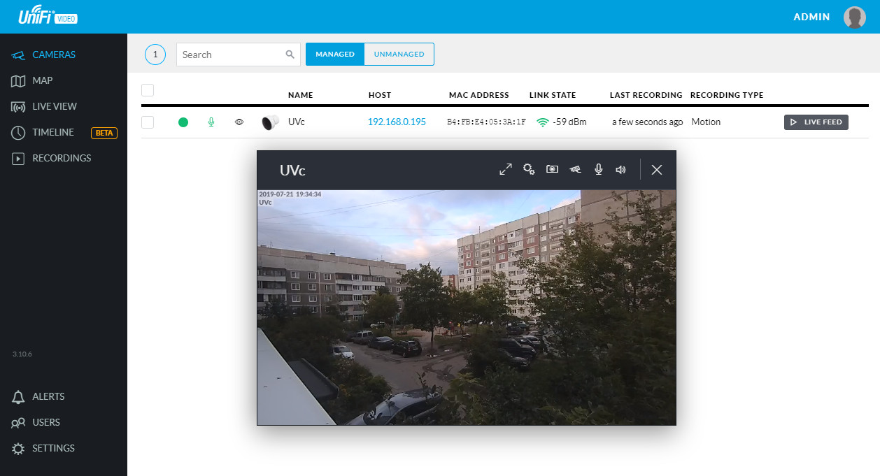 Однако основной инструмент для управления камерами и записью, как становится понятно — это сервер. Аппаратный ли это регистратор либо программный на ПК — особой разницы нет. Сразу после того, как пользователь подключит хотя бы одну камеру, она появляется в списке камер главной страницы сервера. Строка содержит информацию о состоянии камеры, ее IP- и MAC-адрес, статус Wi-Fi-соединения в dBm. Здесь же, в строке, имеется кнопка Live Feed, нажатие которой вызывает плавающее окошко фиксированных размеров, в котором отображается живая трансляция с выбранной камеры.