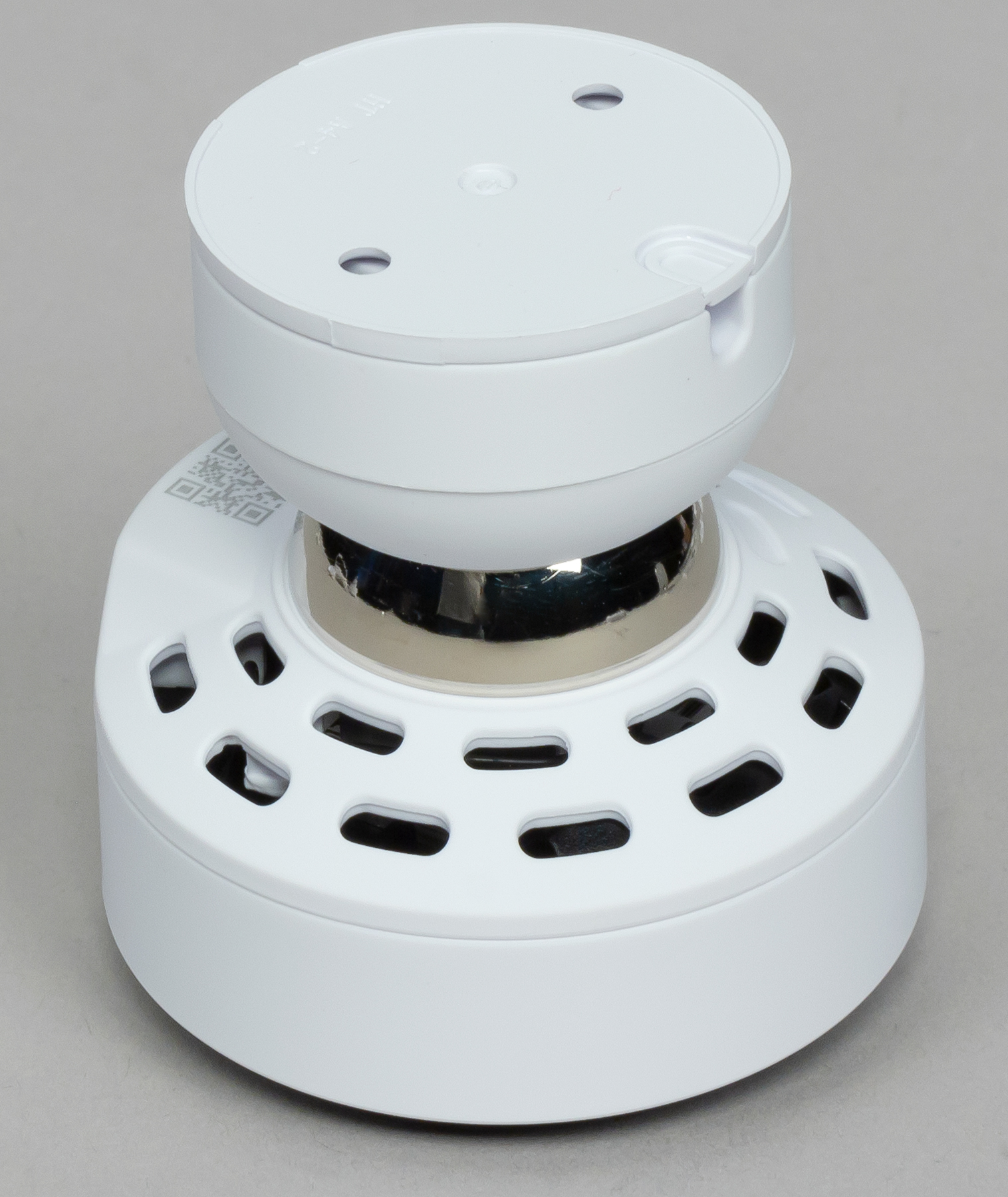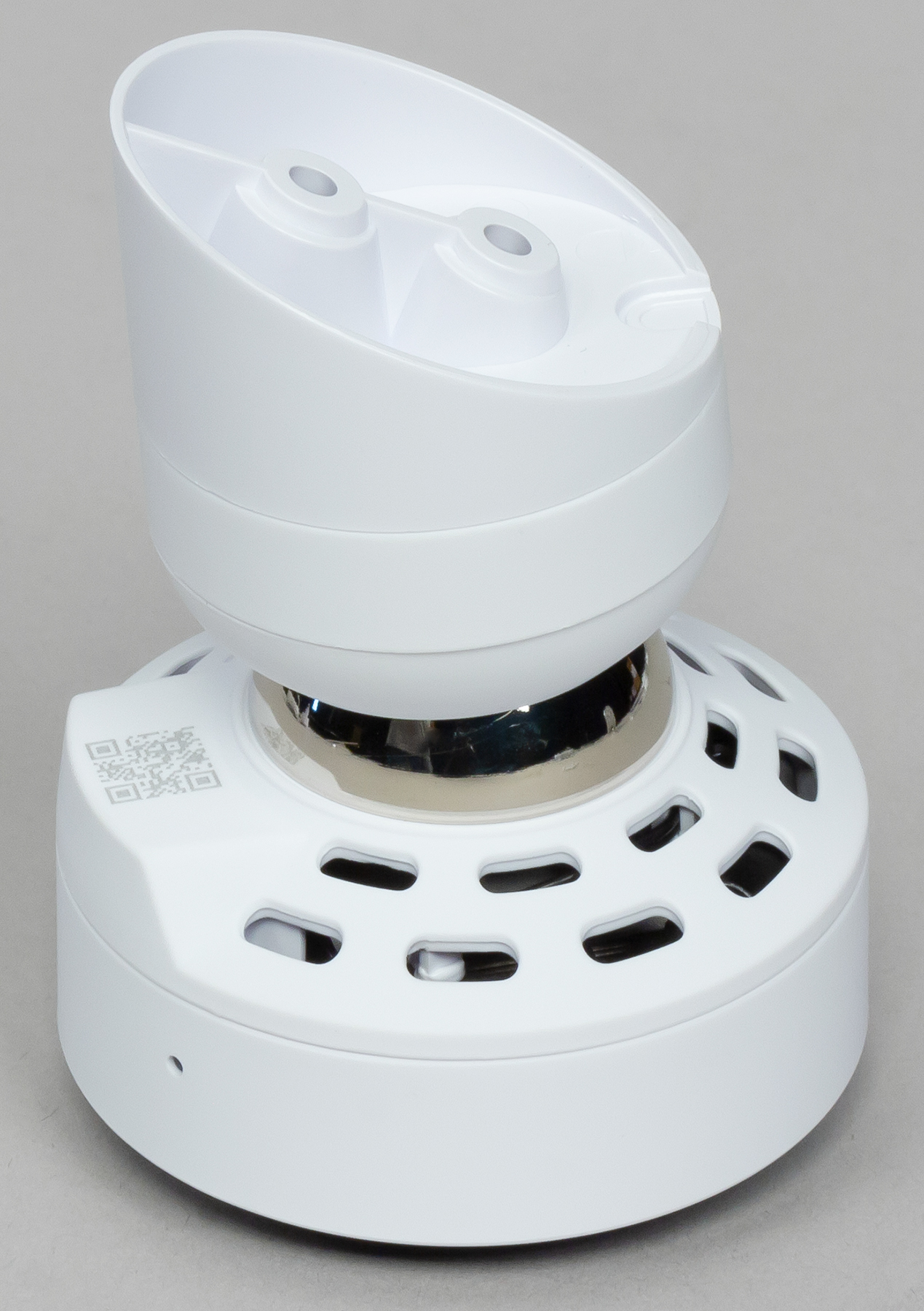 Фронтальная поверхность камеры изготовлена из матового пластика черного цвета, он не бросается в глаза и его трудно заметить в полутьме. А значит, если установить камеру в розетку, то вполне можно получить скрытую систему наблюдения. По периметру вокруг центрального глазка-объектива можно видеть множество мелких отверстий. Под ними находятся два инфракрасных светодиода, которые помогают камере видеть в темноте. Датчик освещенности также вынесен на лицевую панель, здесь же находится отверстие встроенного микрофона. Кстати, на удивление чувствительного.