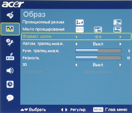 Режимов геометрической трансформации четыре: Авто — максимальный размер с сохранением исходных пропорций (пропорции считаются по пикселям); 4:3 — вывод в формате 4:3, вписанном по высоте; 16:9 — в формате 16:9 и L.Box — для формата Letter Box. Есть цифровое увеличение с возможностью сдвига области увеличения. Кнопка HIDE временно выключает проекцию, а кнопка FREEZE переводит проектор в режим стоп-кадра.