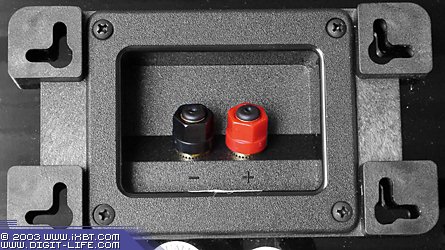 Блок разъёмов у всех акустических систем одинаковый. И тут разработчики особо не заморачивались: на всех АС установлены незамысловатые винтовые терминалы с полимерными колпачками. Тем не менее, металлические части разъёмов позолочены, а сами терминалы допускают подключение разъёмов «лопатка» и «банан». Четырёхкабельное подключение не предусмотрено ни в одной из моделей.