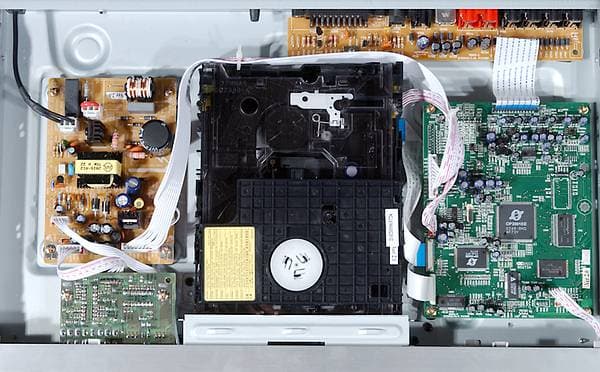 Слева находится блок питания. Он выполнен по импульсной схеме, монтаж аккуратен, все элементы распаяны. На передней панели находятся платы контроллера сенсорного управления, VFD дисплея и микрофонных входов. Особенностью конструкции является отсутствие выключателя питания, схема блока питания все время находится под напряжением, отключить плеер от питающей сети можно только вынув вилку из розетки. Справа находится основная плата электроники плеера, плата собрана аккуратно, качественно. Сзади находится плата аналоговой и интерфейсной части.