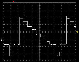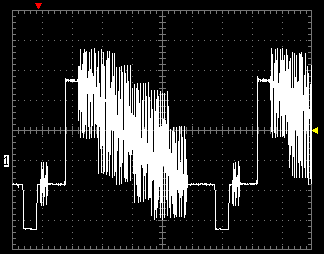 При тестировании осциллограф подключался на композитный видеовыход нагруженный на резистор 75 Ом. Вертикальный масштаб — 0,2 В/деление, горизонтальный — 5 мс/деление.