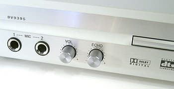 На передней панели справа от кнопки Power, которая на самом деле является кнопкой включения-выключения режима stand by, находятся два микрофонных входа типа jack для караоке. Регулятор уровня микрофонных входов и уровня реверберации выполнены в виде кнопок которые при нажатии выезжают и позволяют выставить нужный уровень. Подобные решения мне приходилось видеть в профессиональных микшерских пультах. Отсутствие раздельной регулировки уровня для разных микрофонов мне не кажется большим недостатком, а то что ручки в нормальном убранном положении не выпирают считаю удобным.