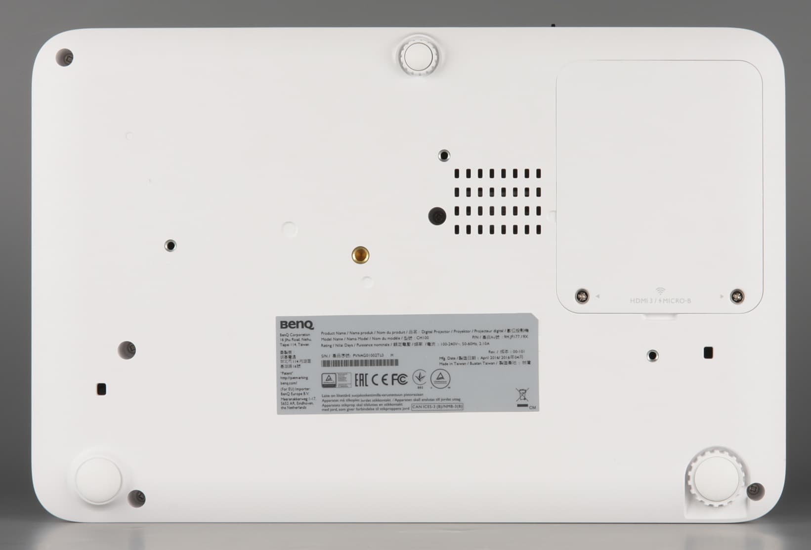 На днище в центре можно обнаружить штативное гнездо (металлическая втулка). Возможно, проектор можно устанавливать на фотографический штатив, но мы не пробовали. Есть также три резьбовых отверстия поменьше (и тоже в металлических элементах), про них известно достоверно, что они предназначены для крепления проектора к потолочному кронштейну. Два винта фиксируют крышку отсека под беспроводной адаптер.