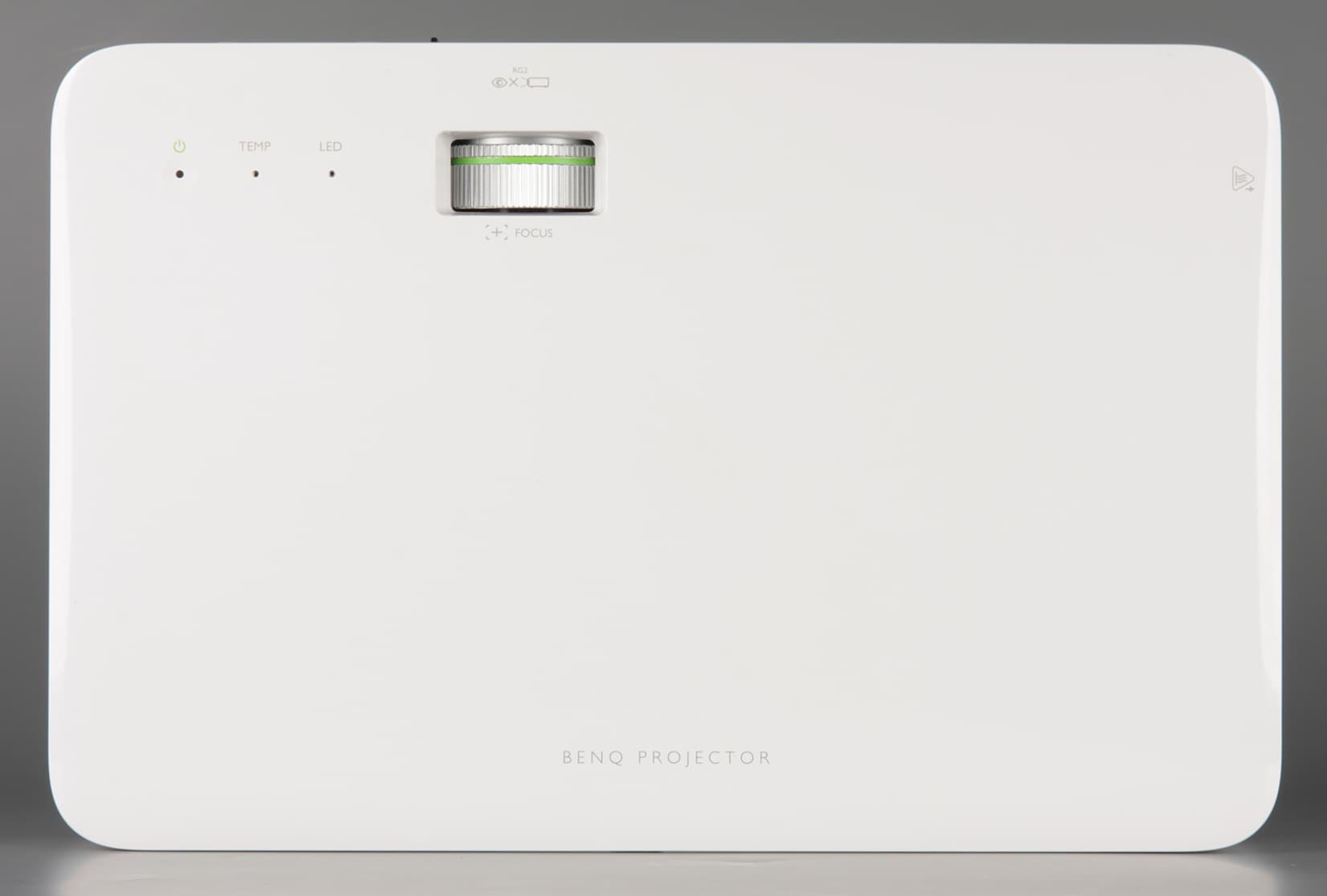 На самом проекторе есть только одна кнопка питания, она сенсорная и находится рядом с индикатором питания. Недалеко размещены еще два индикатора. В режиме ожидания индикатор питания неярко светится оранжевым, в переходных режимах индикатор мигает зеленым, при работе постоянно светится зеленым (можно отключить в меню настроек).