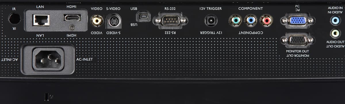 Чтобы было проще читать подписи к разъемам и при потолочном размещении, каждый разъем подписан дважды, вторая подпись перевернута на 180°. Также на задней панели можно обнаружить разъем для замка Кенсингтона. ИК-приемников два: спереди и сзади. На правом боку — крышка отсека лампы (лампу можно менять, не снимая проектор с кронштейна). Воздух для охлаждения забирается через решетки на боковых панелях и на днище, а выдувается через правую фронтальную решетку (вперед и вправо), левая фронтальная решетка — декоративная.