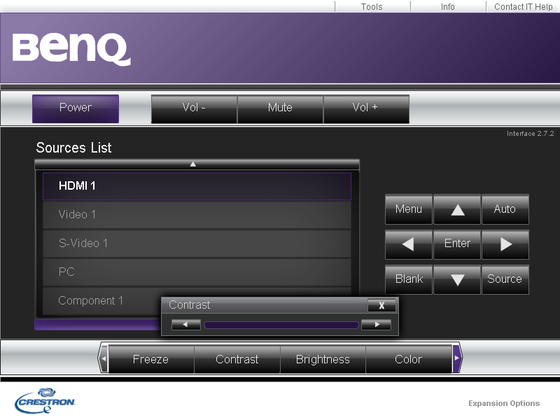 VGA-вход совместим и с компонентными цветоразностными видеосигналами (потребуется соответствующий переходник на 3 RCA). Аудиовход один — гнездо 3,5 мм миниджек. Звук на внешнюю аудиосистему выводится через второе гнездо 3,5 мм миниджек. Для передачи видеосигналов с VGA-входа на внешний монитор предназначен VGA-разъем черного цвета. Несколько нестандартным решением выгладит использование коаксиального (с центральным штырьком) разъема для подключения экрана с электромеханическим приводом. Питание на проектор подается через стандартный трехштырьковый разъем. Видеовходы по циклу перебираются кнопкой SOURCE на корпусе или непосредственно выбираются 5-ю кнопками на пульте или в меню. Есть отключаемый автоматический поиск активного подключения. USB-интерфейс предназначен для использования в сервисных целях. Проектором, видимо, можно дистанционно управлять по интерфейсу RS-232. Также посредством RS-232 производится обновление микропрограммы проектора. Альтернативный интерфейс для дистанционного управления — это стандартный порт Ethernet под витую пару. Для контроля и управления подойдет любой браузер (но обязательно с поддержкой Shockwave Flash), в котором нужно открыть страницу встроенного в проектор WEB-сервера.