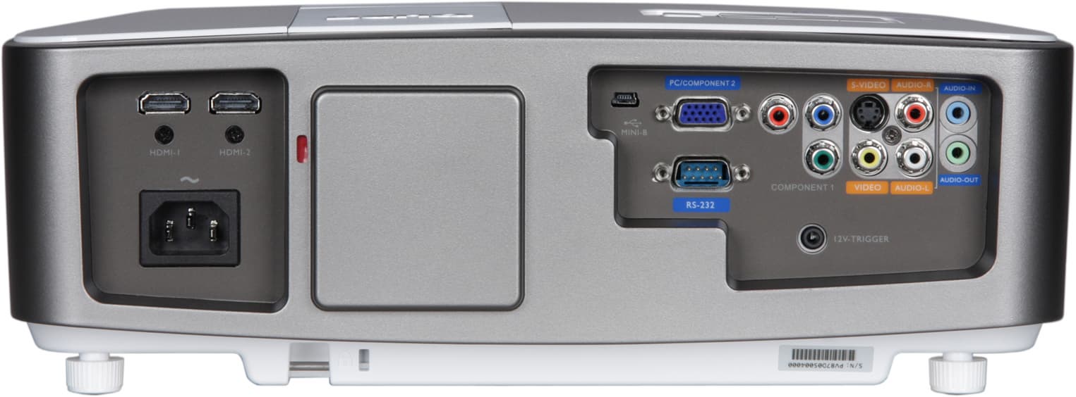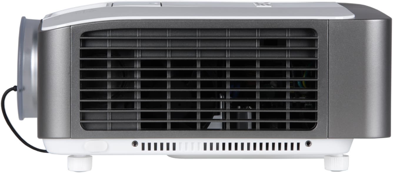 На дно этих ниш наклеен лист прочного прозрачного пластика — металлические края разъемов видимых царапин на нем не оставляют. Подписи к разъемам мелковаты и в основном не очень контрастные. Также на задней панели уже фактически на днище можно обнаружить разъем для кенсингтонского замка и более надежный стальной штифт для крепления «противоугонного» тросика. Правый и левый бока — сплошные решетки вентиляции, за ними можно разглядеть вентиляторы и относительно большие громкоговорители, расположенные ближе к передней части проектора.