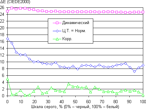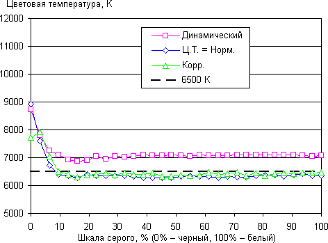 В ярком режиме приоритетом явно является яркость, а не качество цветопередачи, но в режиме Ц.Т. = Норм. с цветами все более менее в порядке — ΔE около 10, что для потребительского устройства считается хорошим показателем, цветовая температура близка к 6500 К, при этом как она, так и ΔE мало изменяются на всей имеющей значение части шкалы серого, что благоприятно сказывается на субъективном восприятии цветового баланса. Ручная коррекция дала очень хороший результат — ΔE минимальная, а цветовая температура фактически равна 6500 К на всей шкале серого. Разумеется, как было показано выше, чем точнее настроена цветопередача, тем ниже яркость и контраст. Тут уж придется выбирать, что важнее.