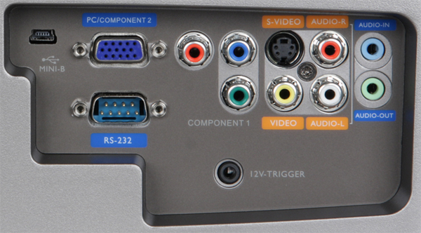 Вход с разъемом mini D-sub 15 pin совместим как с компьютерными VGA-сигналами, так и с компонентными цветоразностными. Яркостный диапазон при HDMI-подключении проектор определяет автоматически, но этот параметр можно установить и вручную. В проектор встроены два громкоговорителя, поэтому есть и пара аналоговых аудиовходов, также входы HDMI и, видимо, приемник WHDI способны принимать звук в цифровом виде. Для подключения внешней аудиосистемы нужно использовать выход AUDIO OUT, если этот разъем задействован, то встроенные громкоговорители отключаются.