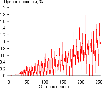 Настройка гамма-коррекции произведена довольно точно, фактический показатель близок к значению настройки. При Выбор гаммы = 2.2 мы измерили яркость 256 оттенков серого (от 0, 0, 0 до 255, 255, 255). График ниже показывает прирост (не абсолютное значение!) яркости между соседними полутонами: