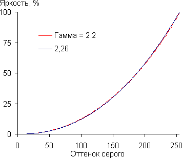 Впрочем, этот незначительный завал в тенях практически не сказывается на картинке. Аппроксимация полученной по 256 точкам гамма-кривой дала значение показателя 2,26, при этом аппроксимирующая функция практически совпала с реальной гамма-кривой: