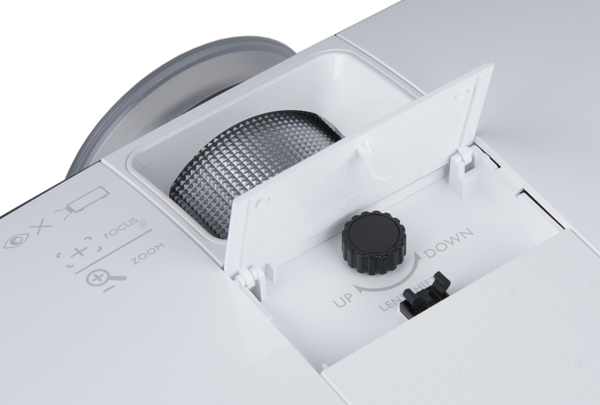 Корпус проектора изготовлен из пластика. Поверхность верхней панели белая и зеркально-гладкая, по периметру корпуса пластик темно-серо-серебристый с легким коричневым оттенком, а днище — матово-белое. Половина верхней панели снимается, открывая доступ к отсеку лампы. Для замены лампы проектор не нужно демонтировать с потолочного кронштейна. На верхней панели находятся прорезь для ребристых колец объектива, крышечка, открывающая доступ к регулятору сдвига объектива, а также контрольная панель с кнопками, индикаторами состояния и окошком ИК-приемника.