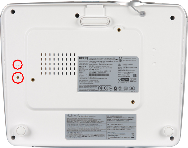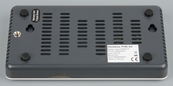 При работе внутренности коробочек нагреваются, поэтому для их охлаждения окружающим воздухом предусмотрены вентиляционные решетки, в том числе и на днище. Передатчик предлагается или просто ставить рядом с источником сигнала (на днище есть резиновые ножки), или вешать (две проушины), или закрепить на чем-нибудь со штативным винтом (соответствующее гнездо имеется). Конструкция приемника предполагает те же виды крепления, плюс два дополнительны варианта с использованием комплектных площадок. Обе площадки — плоская и угловая — прикручиваются к корпусу приемника идущим в комплекте штативным винтом. Затем, пропустив стяжку с «липучкой» через плоскую площадку, приемник можно примотать, например, к стойке потолочного крепления проектора. Угловая площадка предусматривает крепление к ряду совместимых проекторов BenQ — на сайте производителя указаны модели W1070+, W1080ST+ или W1350. Мы, как и указано выше, использовали проектор BenQ W1070+. На днище проектора есть фиксатор и резьбовое гнездо в металлической втулке (помечены красными кружками на фотографии ниже), к которым и крепится угловая площадка с помощью комплектного винта М3.