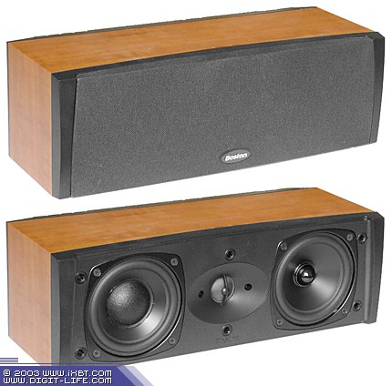 Двухполосная акустическая система центрального канала. В колонке только два настоящих динамика. Находящийся слева от ВЧ драйвера (на фото он выделяется большим пылезащитным колпачком) — это не динамик, а пассивный радиатор. Конструкция корпуса аналогична модели CR-85: пластиковые передняя и задняя панели соединены стяжками. Остальные стенки корпуса изготовлены из прессованного картона.