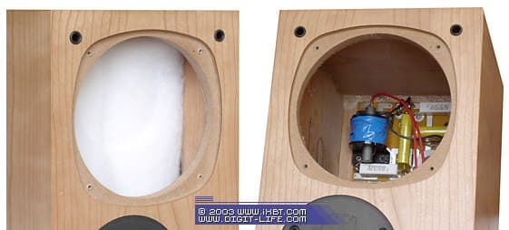 Поскольку Richmond 3 почти вдвое дешевле роскошных Warwick 3, увидеть столь же серьёзные меры по звукопоглощению мы особо и не надеялись. но частично ошиблись. Внутренняя фанеровка по-прежнему есть (похвально для АС ценой $450), однако битумного поглотителя мы уже не нашли. В роли традиционного звукопоглотителя выступает привычный синтепон. Дело в том, что, помимо цены, есть ещё и фактор целесообразоности: корпус «Ричмонд 3» довольно компактен, да и отдача по низким частотам у этих АС заметно меньше, нежели, у «Уорвик 3», поэтому вполне можно предположить, что в битумных листах просто не было надобности.