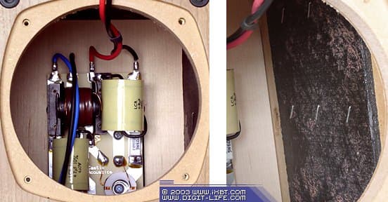 Осмотр «подкапотного пространства» произвёл на нас крайне благоприятное впечатление. Стоит начать с того, что с различными резонансами и вибрациями конструкторы боролись комплексно, применив аж три способа акустической оптимизации внутреннего пространства корпуса. Первое, что бросается в глаза — поглотитель, который в данном случае изготовлен не из синтепона, а из листового поролона толщиной примерно 2,5 см. Как вы понимаете, на время съёмок он был извлечён. Этот листовой поролон закрывает все стенки АС, включая днище. После его демонтажа взору открываются фанерованные изнутри панели корпуса: используется «бутерброд» из шпона, листа MDF и листа фанеры. Такая слоёная панель весьма устойчива к резонансам и вибрациям. И, наконец, на боковых стенках мы обнаружили листы битума (!), который, как известно, является поглотителем самых низких частот и демпфером, уменьшающим возможные вибрации стенки корпуса, одновременно. Такой подход разработчиков к конструкции далеко не самых дорогих АС заставляет лишь снять шляпу. Хотя, приятные сюрпризы на этом не ещё закончились.