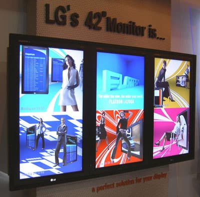 Фирма LG представила очень много интересных устройств, в частности 71″ (1,8 метра в диаметре) плазменную панель, о которой уже писалось в новостях iXBT.com, а также комбинационную панель из 3-х 42″ плазм: