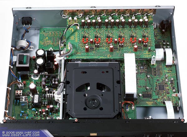 Новый плеер DV9500, несмотря на поддержку HDMI и очень красивый позолоченный шильдик с логотипом на передней панели, не имел возможности подключения по i-Link, а также, как видно с первого взгляда на любезно предоставленной пресс-центром Marantz фотографии внутренностей, в нем был использован традиционный импульсный блок питания, а потому аппарат не произвел должного впечатления. И напрасно, если присмотреться к его содержимому внимательнее, то можно увидеть, что есть и аналоговый блок питания для блока ЦАП и, судя по всему, последний сделан на дискретных элементах, что позволяет предположить наличие довольно качественного сигнала на аналоговом выходе, несомненно способного порадовать аудиофилов.