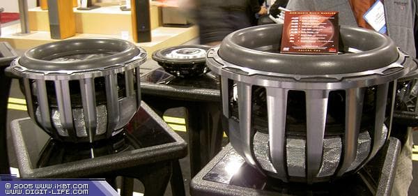 Поблизости от лидирующих фирм располагался стенд компании Earthquake. Ее хозяин, совершенно харизматическая личность Джозеф Сахийон, говорил одновременно со мной и двумя немцами-покупателями. Продавцы в High-End салонах должны брать уроки у господина Сахийона. Немцы с затуманенными глазами только кивали головой и повторяли как заколдованные: «it creates» (он выдает) и «this is what we need» (то, что нам нужно). Это было целое представление — как он рассказывал о своем товаре, наступая ногой на диффузор 15« динамика, чтобы показать длину хода диффузора, откручивая большие позолоченные клеммы с колонок и отдавая их всем в руки, чтобы убедились в том, насколько они тяжелые, солидные и дорогие. А также рассказывая истории о том, что его сабвуферы использовали как ОЕМ очень известные и дорогие High-End компании, естественно с обещанием не разглашать названия этих фирм… в общем, настоящий профессионал в продажах. Надо заметить, что динамики Earthquake действительно производили серьезное впечатление своими размерами и красотой изготовления — впору ставить не внутри, а снаружи. Поскольку была возможность их прослушать, я снова достал свой демо-диск DVD-A DTS — показан на картинке для сравнения с размером 15″ динамика. В качестве источника использовался плеер Sony, в качестве процессора — Lexicon МС12 со всеми возможными модификациями (v4) и полной профессиональной калибровкой. Что сказать — сразу после прослушанной презентации Klipsch THX Ultra 2 не было той гармонии и слитности звука, преобладали низкие с ощутимым давлением на уши — чувство, сходное с изменением давления при посадке самолета. Вполне допустимо, впрочем, что кто-то предпочитает именно такой звук. А я пошел дальше.