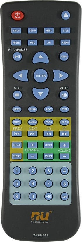 Пульт ДУ представляет собой компромиссный вариант: с одной стороны он полнофункциональный с кучей кнопок, с другой — относительно небольшой и легкий. Курсорные кнопки, а также 4 вокруг них расположены удобно и легко находятся на ощупь. Все другие (кроме вкл./выкл. и выброса диска) — очень мелкие и расположены тесными рядами, поэтому нажать нужную непросто. Отметим также, что цветовая дифференциация это хорошо, но когда она приводит к белым надписям на желтом или светло-зеленом фоне, то это плохо. Как нам кажется, цифровые кнопки на пульте портативного DVD-плеера вещь абсолютно лишняя, лучше от них избавиться и расположить кнопки попросторнее.