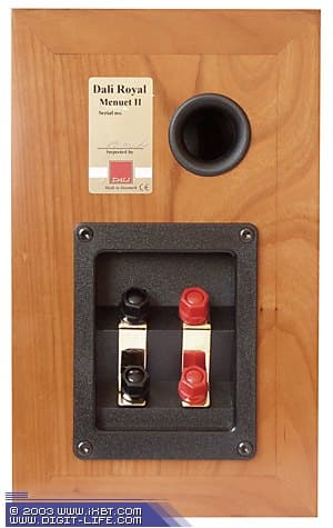 Задняя панель Menuet II демонстрирует класс и качество изделия. Во-первых, конечно же, это качество отделки. Взгляните, насколько точно состыкованы листы шпона. Подобран даже рисунок фактуры дерева. Во-вторых — заметно, что корпус собран из очень толстых плит — из те же самых, из которых изготовлен весьма крепкий корпус «Скипетра». Ну и, в-третьих — блок терминалов, позволяющий при желании использовать и четырёхкабельное подключение, и коннекторы «банан». Хотя удивляться тут особо нечего — от компактных колонок ценой в восемь сотен долларов чего-то такого мы и ждали. Так что всё в порядке.