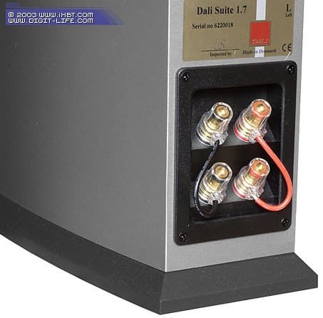 Блок разъёмов используется тот же самый, какой мы уже видели на «юбилейной» модификации Blue 5005AE. Это очень солидные позолоченные винтовые разъёмы, «одетые» в прозрачные полимерные корпуса. Допускается использование как оголённого кабеля довольно большого сечения (до 4 мм² точно), так и разъёмов «banana» и «pin». Возможно четырёхкабельное подключение (bi wiring). В случае использования обычного подключения, в качестве перемычек используются небольшие отрезки кабеля, которым выполнена внутренняя разводка АС. Перемычки даются в комплекте и уже готовы к использованию (концы зачищены и залужены серебром).