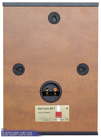 Задняя стенка Suite R 0.7 совершенно прямая. Как видим, помимо блока разъёмов, присутствуют целых три паза для настенного крепления АС (фото чуть ниже). Блок разъёмов весьма интересен и необычен: очень компактные позолоченные разъёмы выглядят винтовыми, хотя на деле являются пружинными. При этом удалось обеспечить немалую площадь контакта, ведь, по сути, от винтового такой разъём отличается только механизмом фиксации: вместо резьбы используется пружина — весьма разумный ход конструкторов.