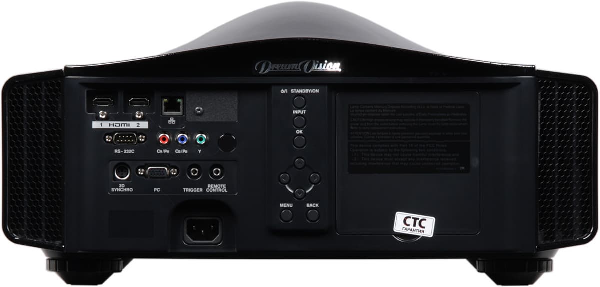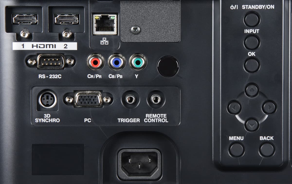 Проектор оснащен двумя HDMI-интерфейсами версии 1.4a, входом VGA и компонентным входом. К компонентному входу можно подключать источники RGB-сигнала с синхронизацией в зеленом канале. Под HDMI-разъемами находятся втулки с резьбой, предназначенные для фиксации HDMI-кабелей с винтовыми зажимами. Переключение между источниками осуществляется перебором с помощью кнопки INPUT на корпусе проектора или непосредственно четырьмя кнопками на пульте, каждая на свой вход. Автоматического распознавания активного подключения нет. В том случае, если автоматическое определение параметров видеосигнала работает неверно, в меню можно принудительно указать некоторые характеристики видеосигналов (например, яркостный диапазон для HDMI). Проектор поддерживает управление по HDMI, видимо, все ограничено просто включением при включении подключенного источника сигнала. В зависимости от установок в меню на выход TRIGGER подается 12 В или при включении проектора, или при выборе анаморфного режима, или не подается вовсе. В первом случае этот выход может управлять экраном с электромеханическим приводом, во втором — приводом анаморфотного объектива. Проектором можно управлять по интерфейсу RS-232C, в руководстве приведены распайка разъема, характеристики протокола и команды. Аналогичным целям служит и Ethernet-интерфейс с разъемом RJ-45 под витую пару. Есть разъем для подключения внешнего ИК-приемника. Разъем типа mini DIN 3 pin предназначен для подключения внешнего излучателя синхронизации стереоскопических очков.