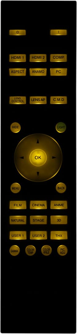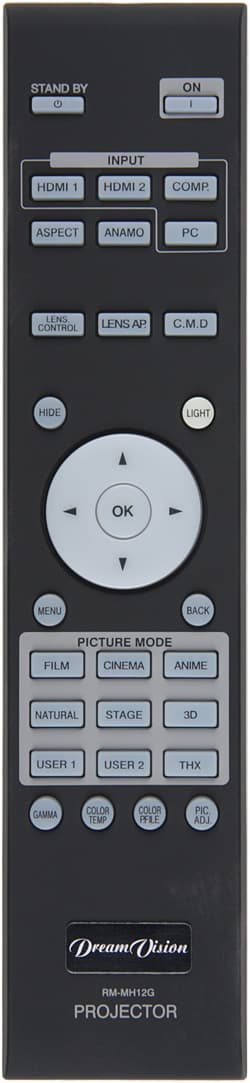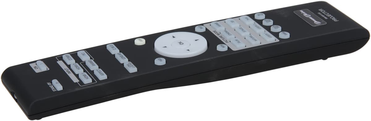 Пульт не очень большой. Его корпус изготовлен из пластика с матовым покрытием типа «Soft touch», на ощупь напоминающим резину. Пульт удобно ложится в руку. Кнопки некрупные, подписи контрастные, но немного мелковаты. Есть достаточно яркая и равномерная светодиодная подсветка, включающаяся небольшой круглой и фосфоресцирующей кнопочкой LIGHT. Включение и выключение проектора разнесены на две разные кнопки.