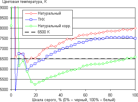Видно, что компоненты хорошо разделены, за счет чего и достигается широкий цветовой охват, но в случае профилей с коррекцией охвата насыщенность уменьшается подмешиванием соседних компонент, и, видимо, включением оптического фильтра (об этом свидетельствует изменение спектров компонент и жужжание, раздающееся из проектора при выборе некоторых профилей). Графики ниже показывают цветовую температуру на различных участках шкалы серого и отклонение от спектра абсолютно черного тела (параметр ΔE) в случае профилей Натуральный и THX, а также после коррекции настройками усиления и смещения трех основных цветов. Близкий к черному диапазон можно не учитывать, так как в нем цветопередача не так важна, а погрешность измерения цветовых характеристик высокая.