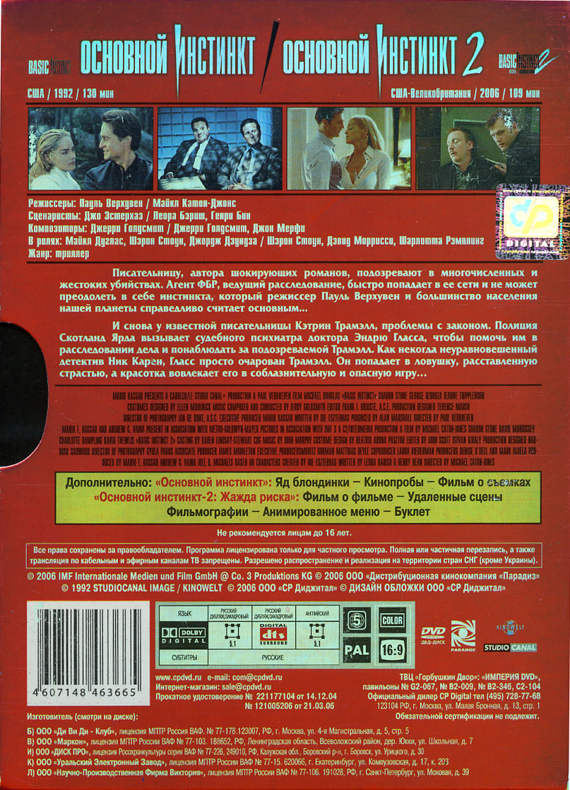 Итак, что получается? Издание весьма хорошо само по себе, но, во-первых, лучшие западные издания все-таки превосходят наше (хотя это и не проигрыш вчистую), а во-вторых, необходимость приобретать «в нагрузку» к первому фильму очень посредственный сиквел удручает. Тогда лучше выбрать бокс с «Шоугелз», хотя это тоже не шедевр. Если вам все-таки нужен «Основной инстинкт 2», то почему бы ни купить однодисковое российское издание? Благо, его стоимость плюс цена американского Unrated Second Edition отнюдь не больше, чем цена рассматриваемого бокса.