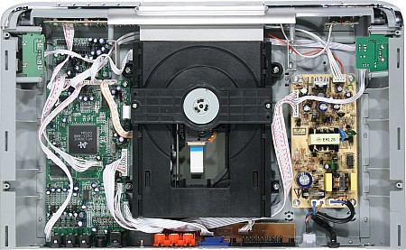 ВидеоЦАПы встроены в него, аудиоЦАПы внешние — используется микросхема WM8766 (6 каналов, SNR = 103 дБ). Аудиосигнал усиливают 4 операционных усилителя F4558 (3 шт. на 6 аудио выходов, при этом микшированная стереопара запараллелена, кажется, с тыловыми, и еще один работает в микрофонном караоке-блоке). Эффект эха при пении в микрофон привносит аудиопроцессор PT2399B от Princeton Technology Corp. Монтаж аккуратный. DVD-привод, возможно, производства SONY, по крайней мере, на каретке привода в двух местах расположен ее всем знакомый логотип.