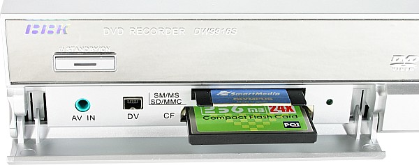 На передней панели под неприметной крышкой находятся фронтальные аудио/видеовходы (в том числе вход miniDV и гнездо для четырехконтактного миниджека, позволяющее с помощью идущего в комплекте кабеля подключать источники с композитным видео- и аналоговым стереофоническим аудиовыходами) и два слота для карт памяти — универсальный, для SM / MS / SD / MMC и специализированный, для CF.