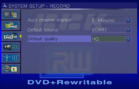 Повторное нажатие во время записи на кнопку RECORD включает режим автоматического отключения записи через выбранный интервал (зависит от количества нажатий), иначе запись остановится по исчерпанию свободного места на диске, при нажатии на кнопку STOP или согласно времени окончания в расписании. Нажатие на кнопку PAUSE во время записи временно ее приостанавливает. Также запись приостанавливается, если на текущем видеовходе пропал сигнал. Непосредственно перед началом записи в ручном режиме, можно, кроме источника и качества записи, выбрать способ записи на диск: начать новый раздел, продолжить последний раздел, перезаписать раздел или перезаписать диск. Если в качестве источника сигнала выбран DV-вход, то появляется возможность управлять подсоединенной к этому входу DV-камерой — соответствующим образом работают кнопки PLAY, REV и FWD, а при нажатии на кнопку RECORD камера синхронно запускается на воспроизведение.