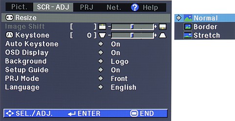 3 режима геометрической трансформации помогают подстроить картинку под формат экрана. В режиме NORMAL картинка демонстрируется на всю область проекции с соотношением сторон 4:3, в STRETCH — изображение поджимается сверху и снизу до соотношения 16:9 (подойдет для анаморфированных фильмов), а в режиме BORDER картинка ужимается в область размером 768 на 576 пикселей, которая располагается в центре экрана. В режимах STRETCH и BORDER параметр Image Shift определяет расположение картинки по вертикали в пределах области проекции. Если сигнал на входе проектора имеет нативное соотношение 16:9, то картинка отображается единственным способом — без искажений во всю ширину экрана с черными полосами сверху и снизу.